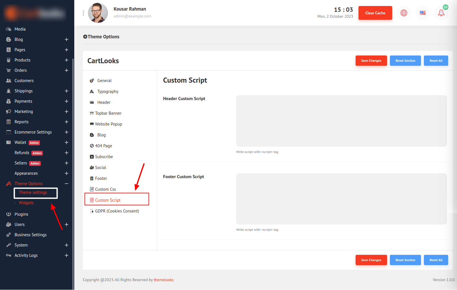 To Add Custom Scripts in Tlcommerce follow Theme Options > Theme Settings. Then Click on the Custom Script Tab.
