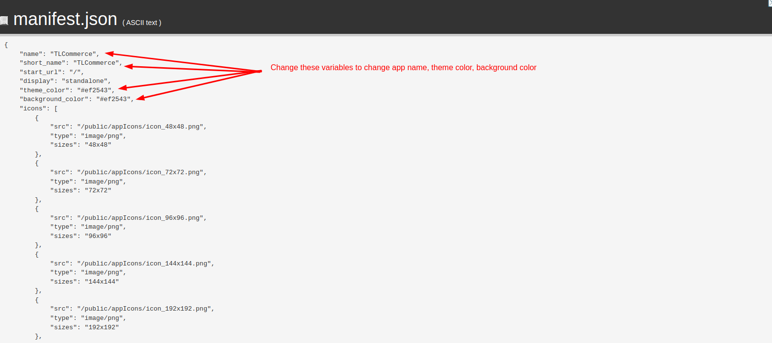 3. if you want to change the theme color, background color & app_name, go to the "manifest.json" file in the root directory and there change "theme_color", "background_color", "name" & "short_name".