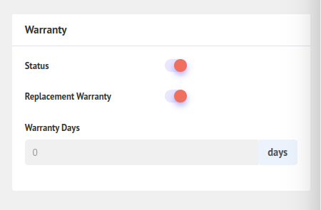9. Warranty. Here you can set product warranty. Warranty Time and Replacement or Not.
