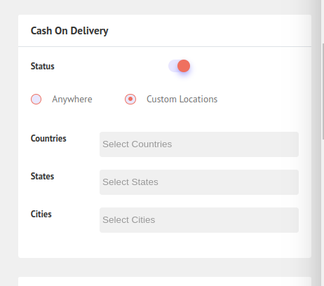 8. Cash On Delivery. You can select a delivery location anywhere or a custom location. And to Update Countries, States, and Cities visit Shippings > Location.