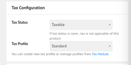 6. Tax. You can select if a product is taxable or not. If tax is applied you have to select a tax profile where the tax rates are given with rates.
