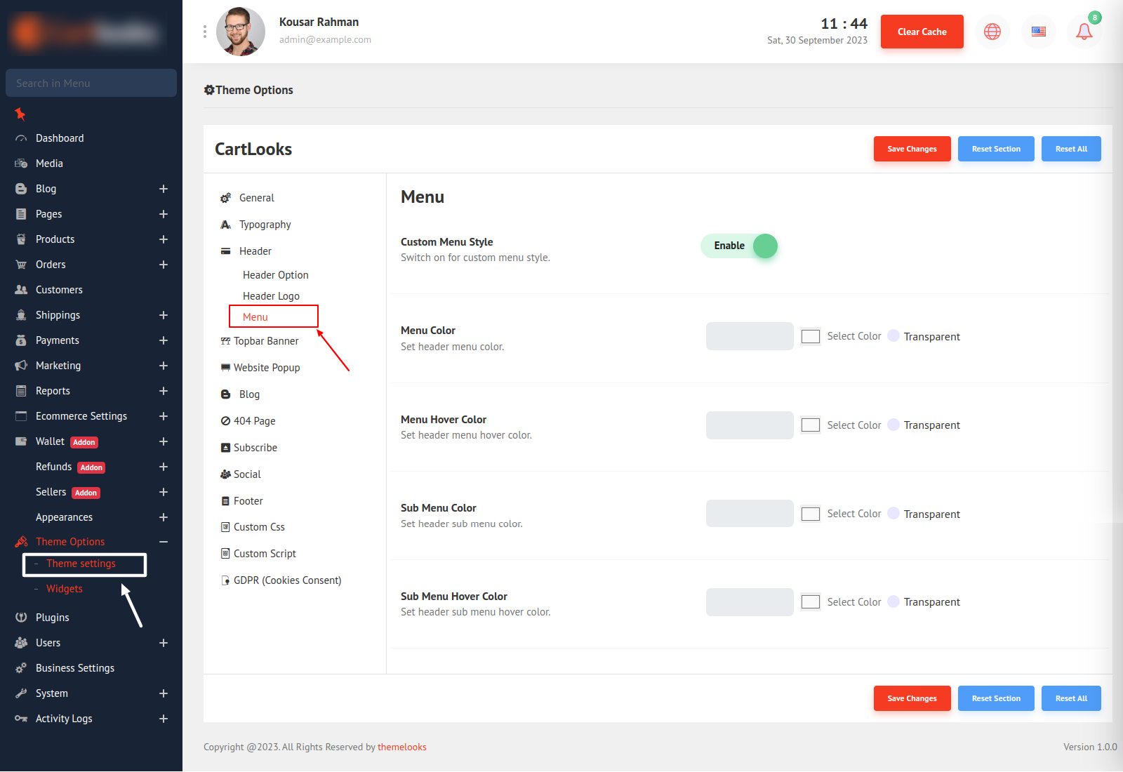 Click Save Changes to save theme options. Click Reset Section to reset only this section. Click Reset All to reset all theme options.