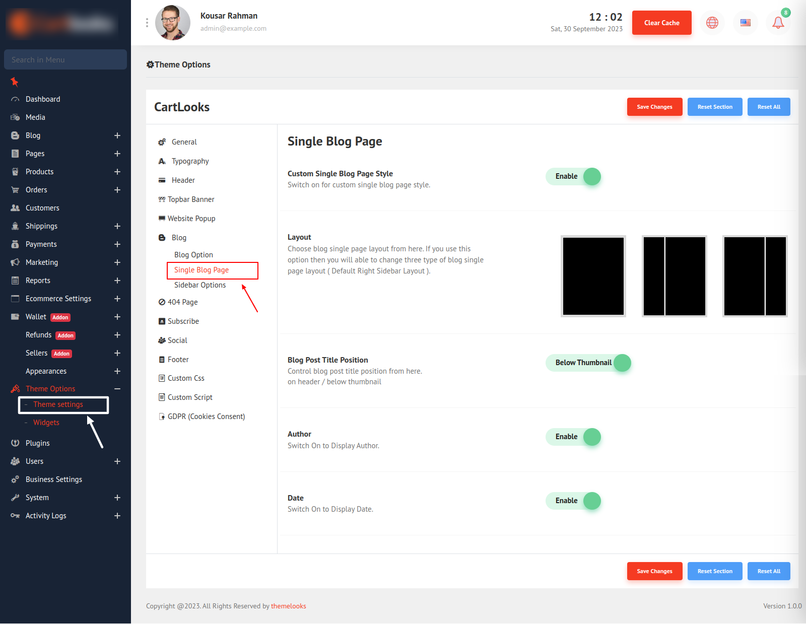 Click Save Changes to save theme options. Click Reset Section to reset only this section. Click Reset All to reset all theme options.