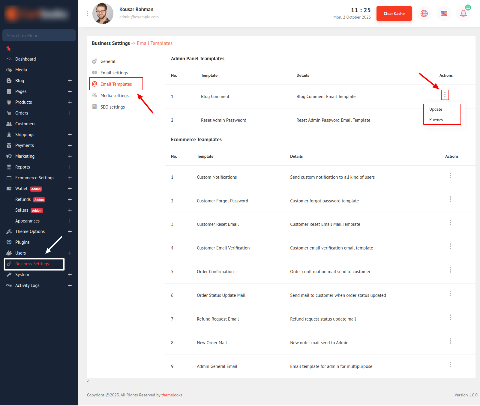 Now to update an email template click the three dots(.)and then click Update. A Modal will appear.