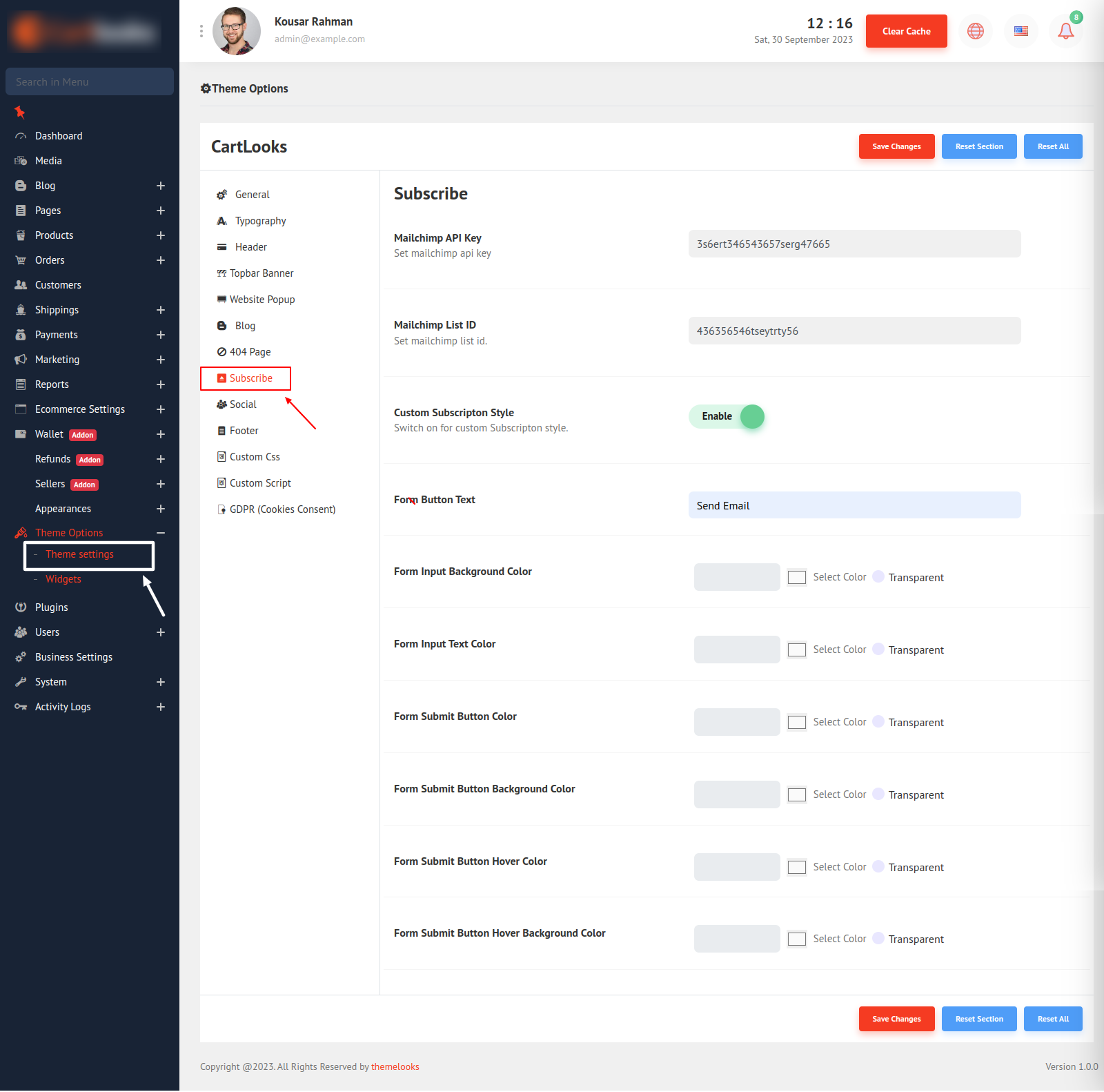 Click Save Changes to save theme options. Click Reset Section to reset only this section. Click Reset All to reset all theme options.