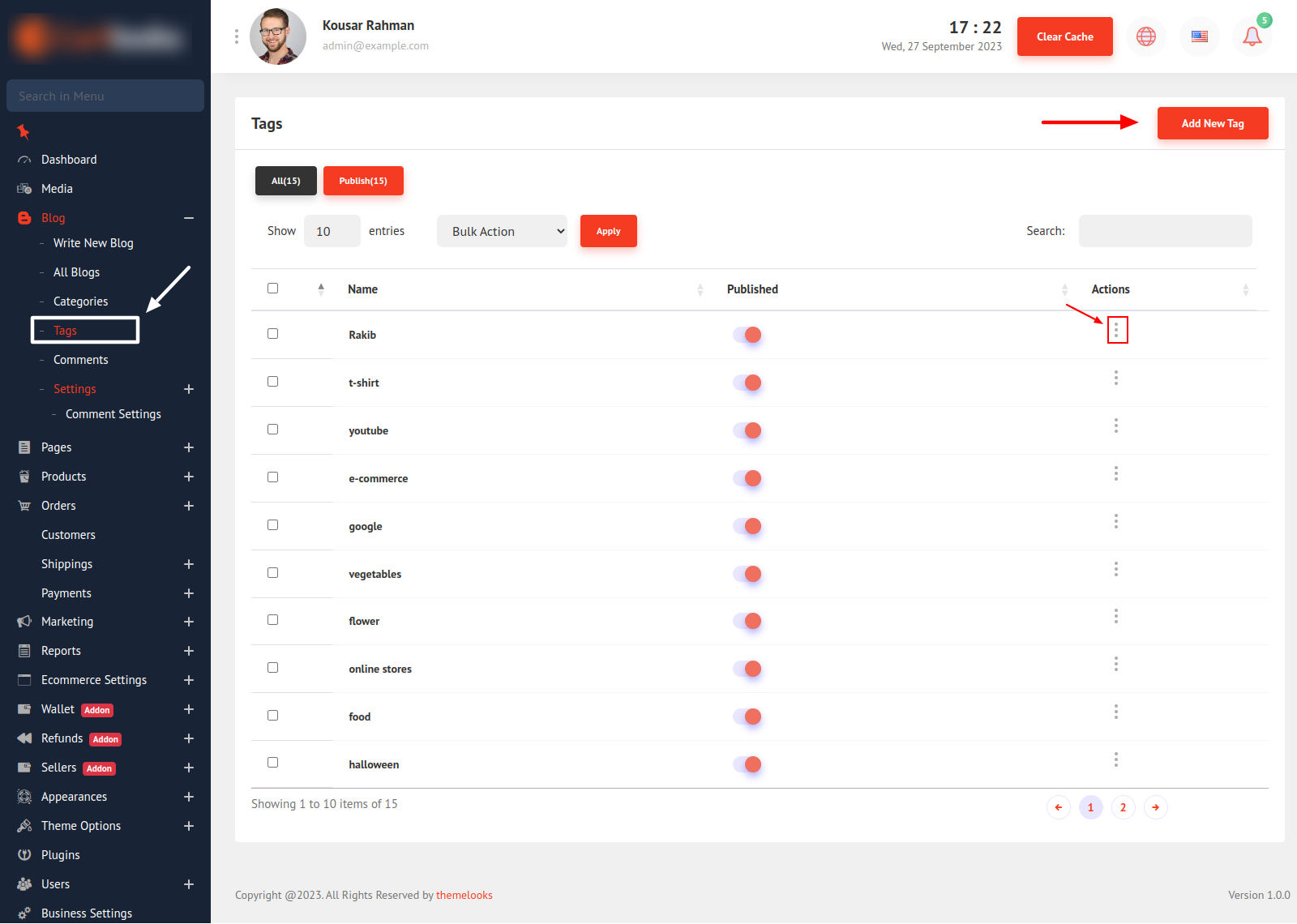 In this post, we will learn how to manage Blog Tags. Follow Blogs > Tags and you will be redirected to the tag list page. Here you can find all the available tags, you can search and find, filter, manage, delete and create new ones.