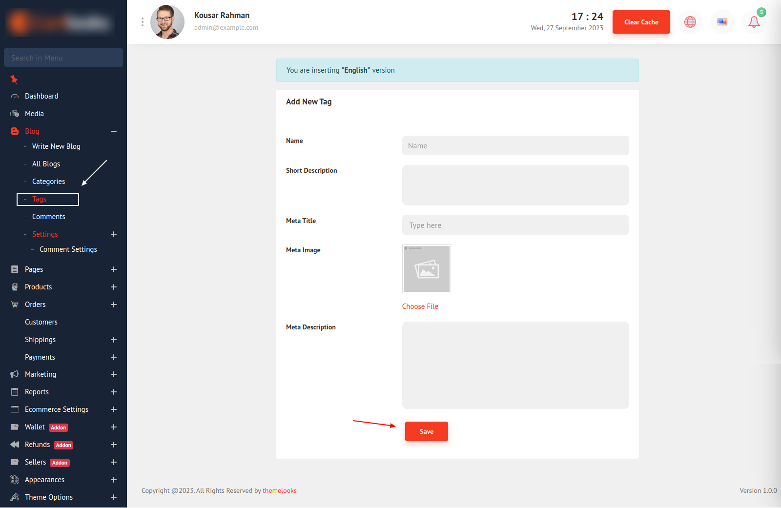 To create a new tag click Add Blog Tag button and you will be redirected to another page. Here you can give a name and edit the permalink and set SEO information.