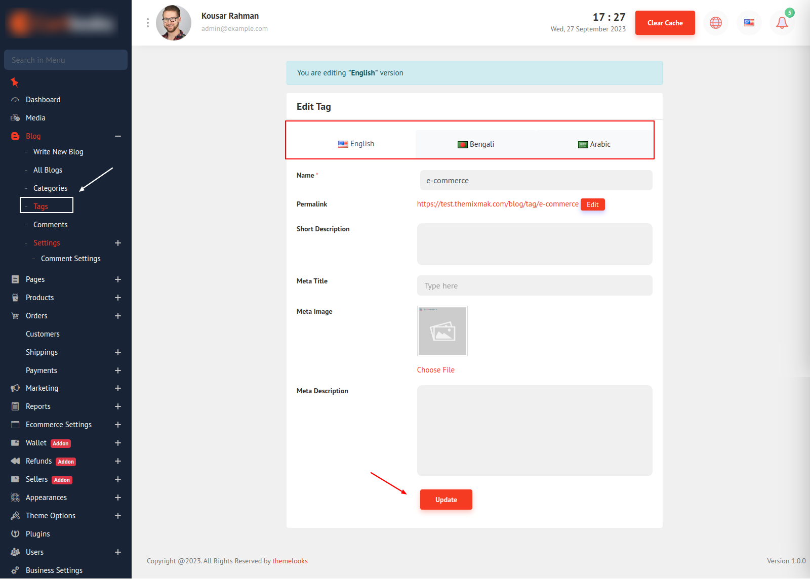 To Edit a tag click the Edit link from the list page and you will be redirected edit page. Here you can translate tag info into another language also. To Delete a tag click Delete from three dots.