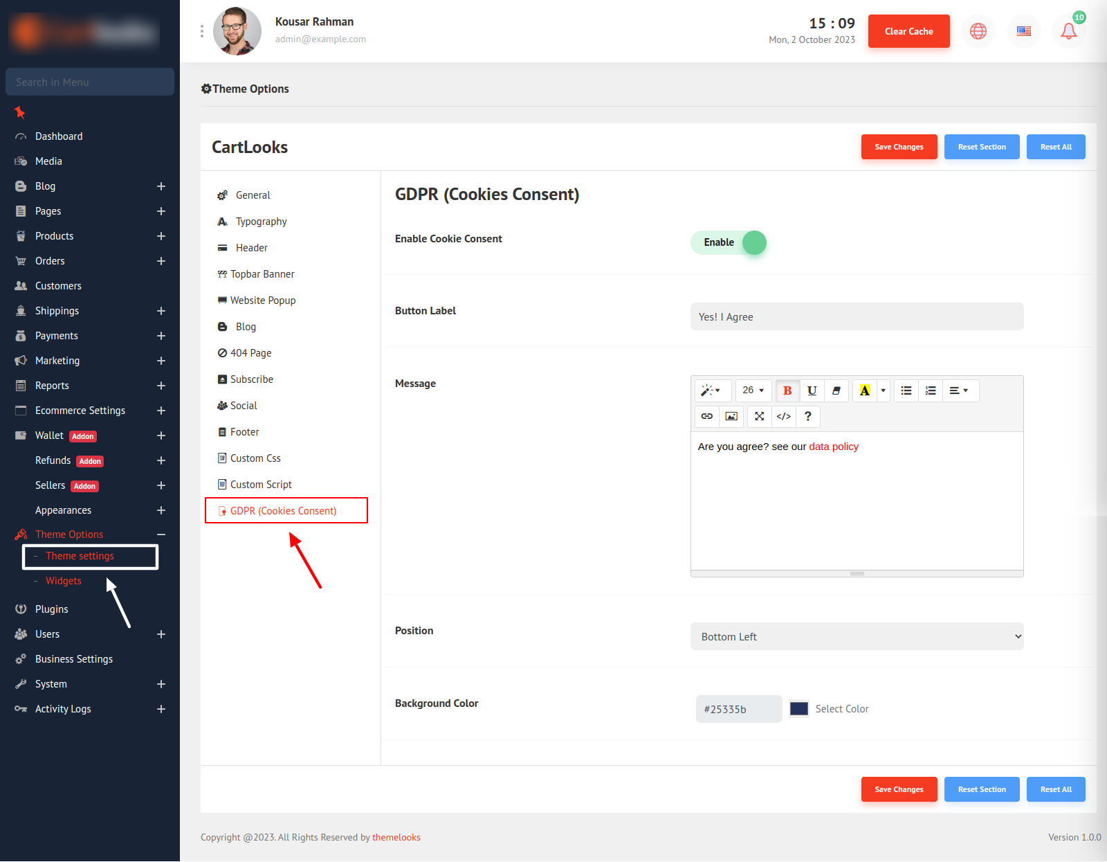 To manage GDRP Cookie Consent Follow Theme Options > General Settings. Click GDRP(Cookies Consent).
