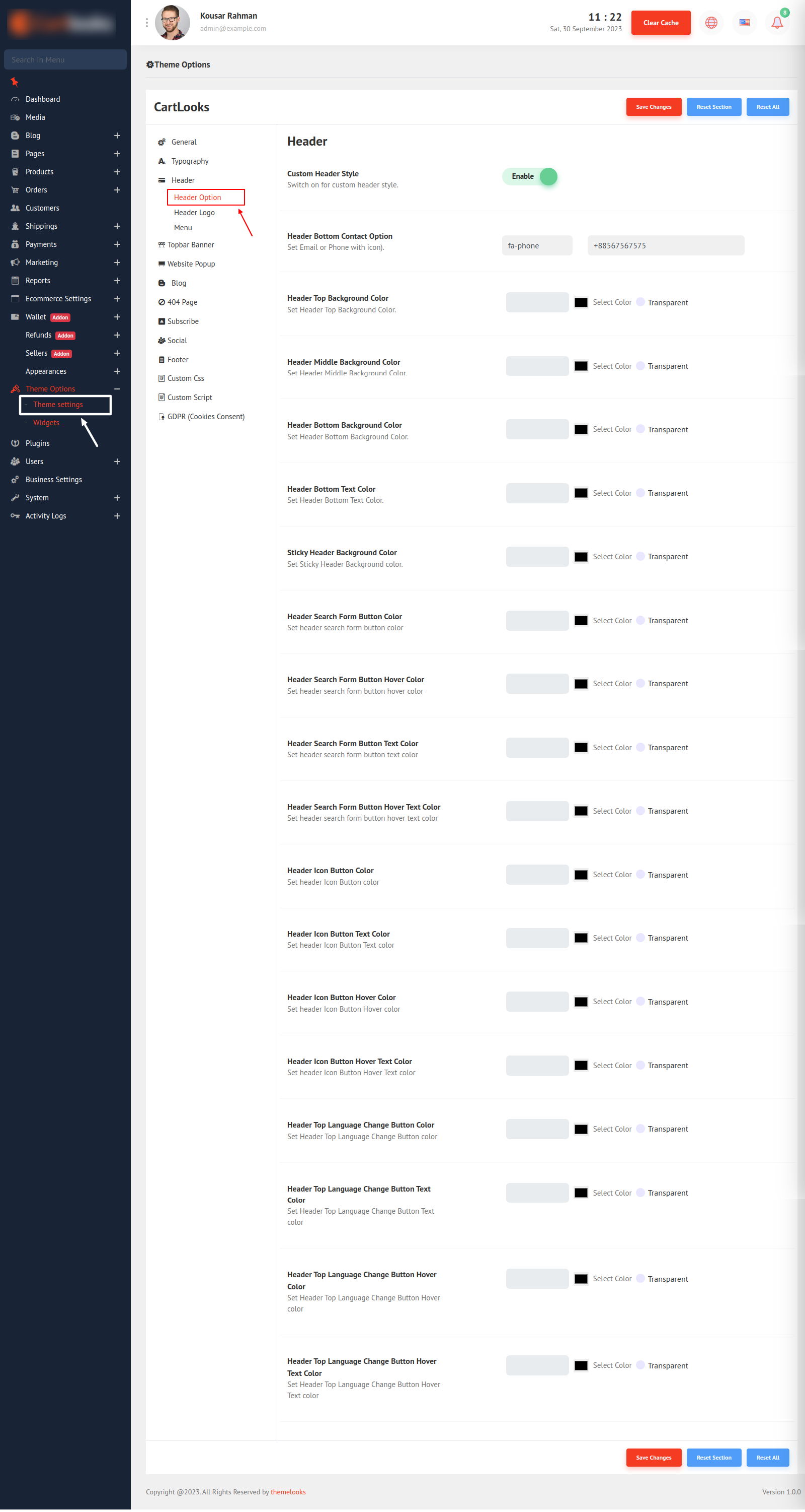 Click Save Changes to save theme options. Click Reset Section to reset only this section. Click Reset All to reset all theme options.