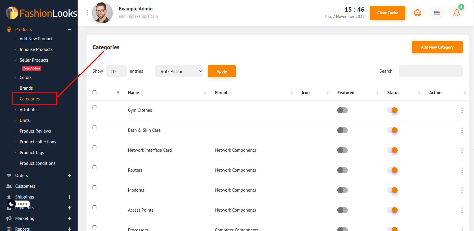 You can see the category list and lots of options. You can add a new category by clicking the Add New Category button on top. It will redirect you to another page.