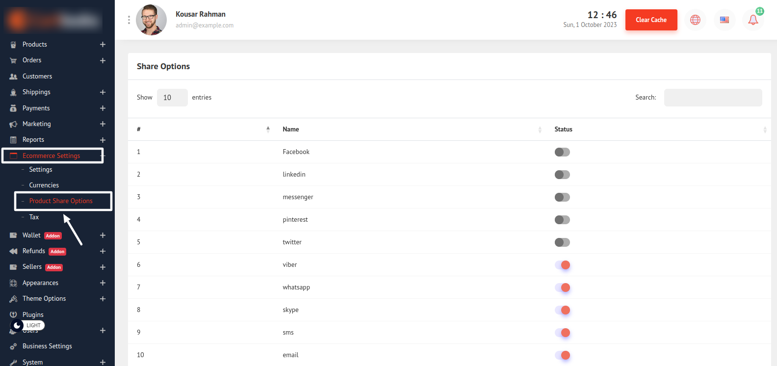 A Customer can share the product link in many media. Here on this page, all the options are available and you can select which options to show. You can turn off the status to hide any option. Go to E-commerce Settings > Product Share Options.