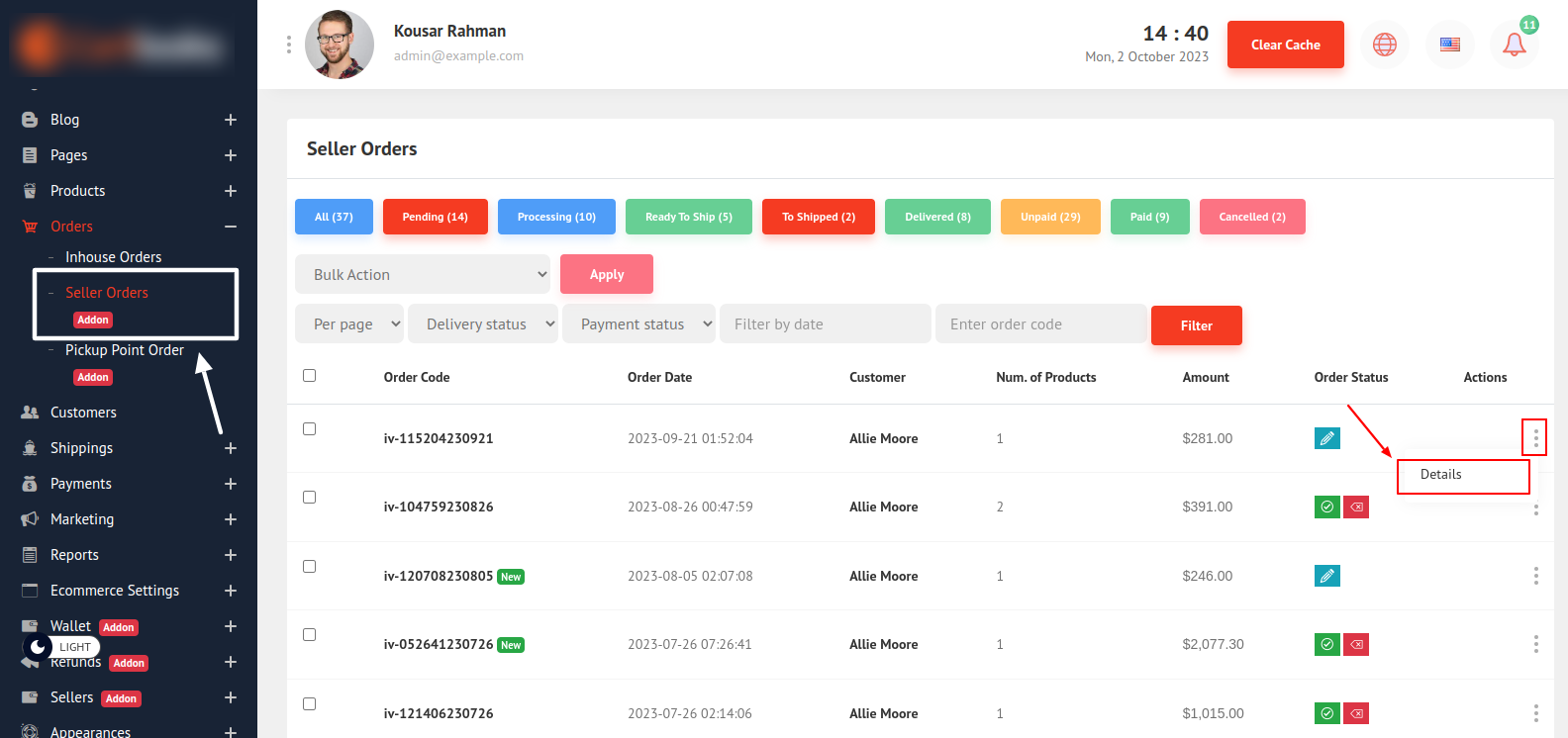 Here you can find all the seller's products. You can handle product approval or publish status. Also, Filter Products, and you can edit product information.