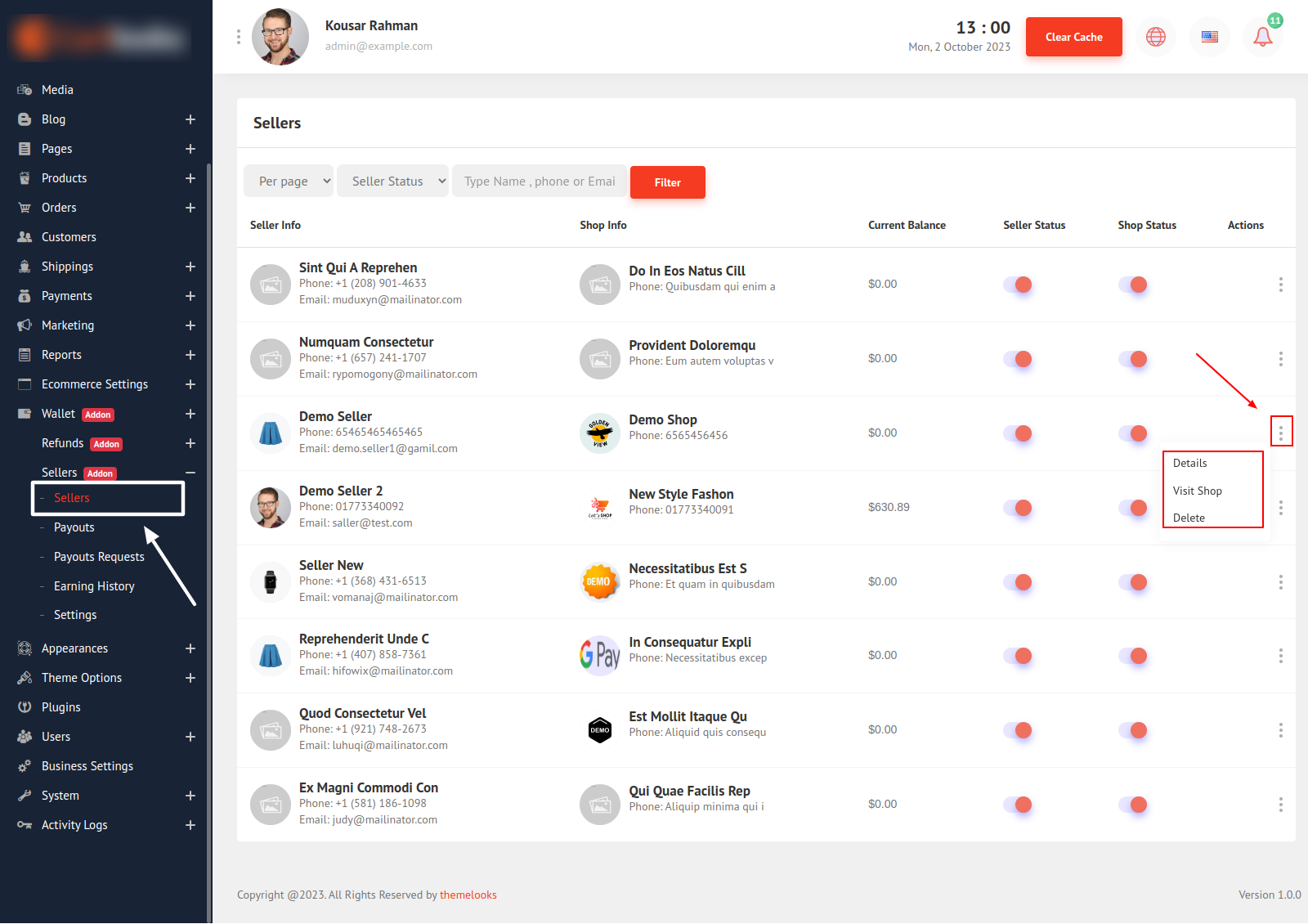 You can filter the list, and delete the seller. Turn on/off Seller and their Shop Status. You Click the Details Link, to visit seller Details information.