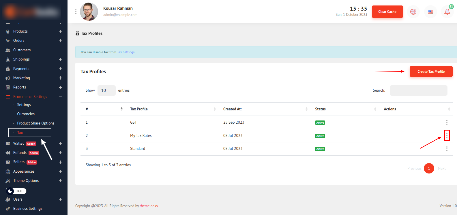 From the list, to manage tax rates for the profile click on three dots (.) in the action column and click Manage Tax Rates. You will be redirected to a new page to create tax rates.