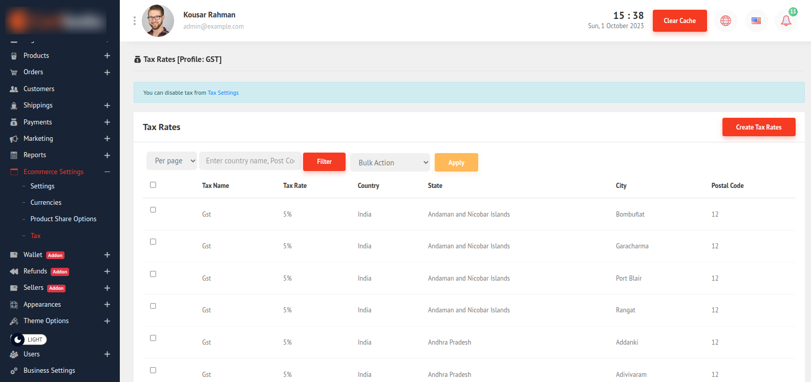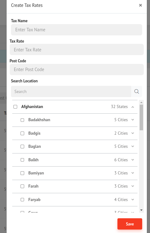 Tax is one of the unique features of our system. You can create a tax profile with your custom location and rates. Go to Tax list from Ecommerce Setting > Taxes.