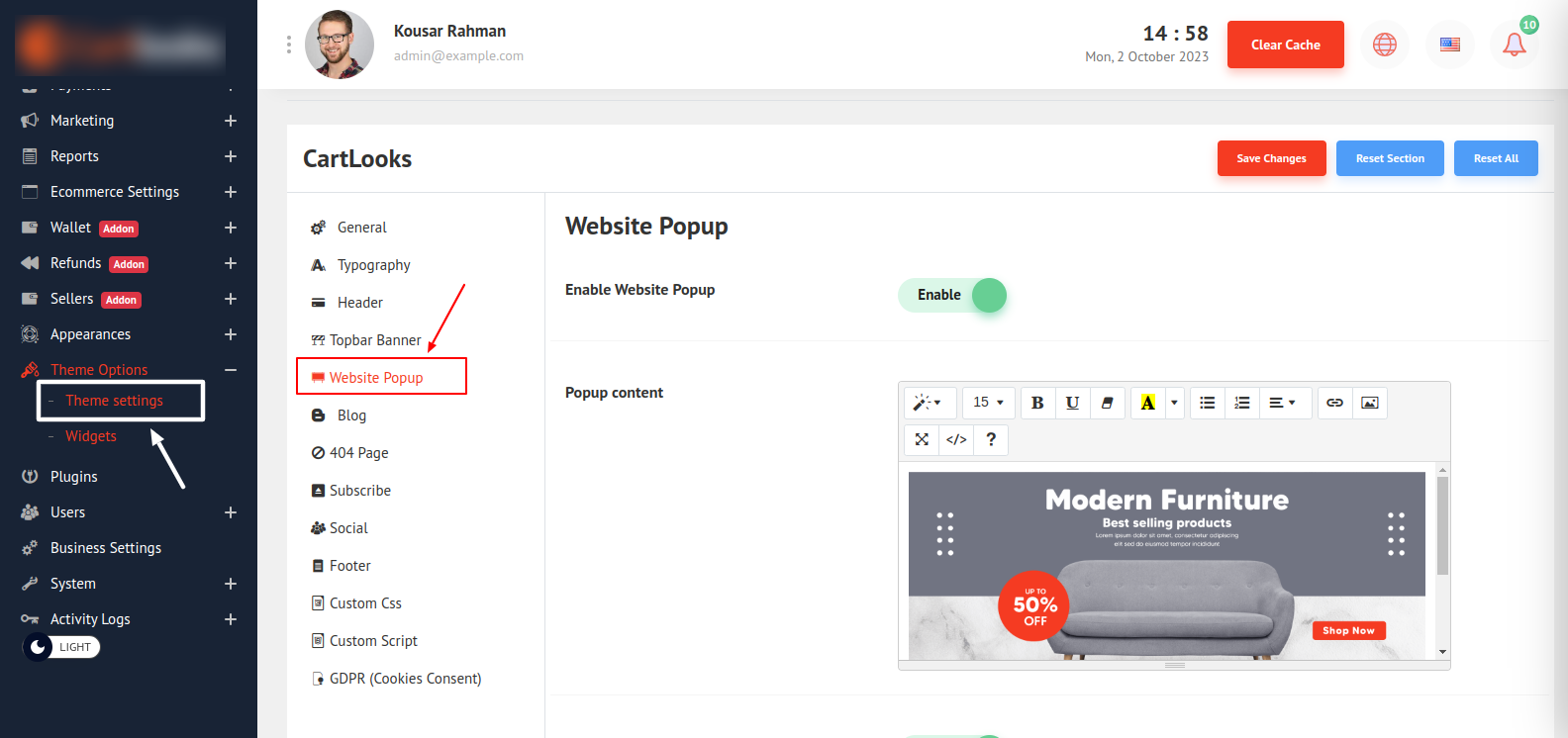 To Manage Website Popup follow Theme Options > Theme Settings. Then Click on the Website Popup Tab.