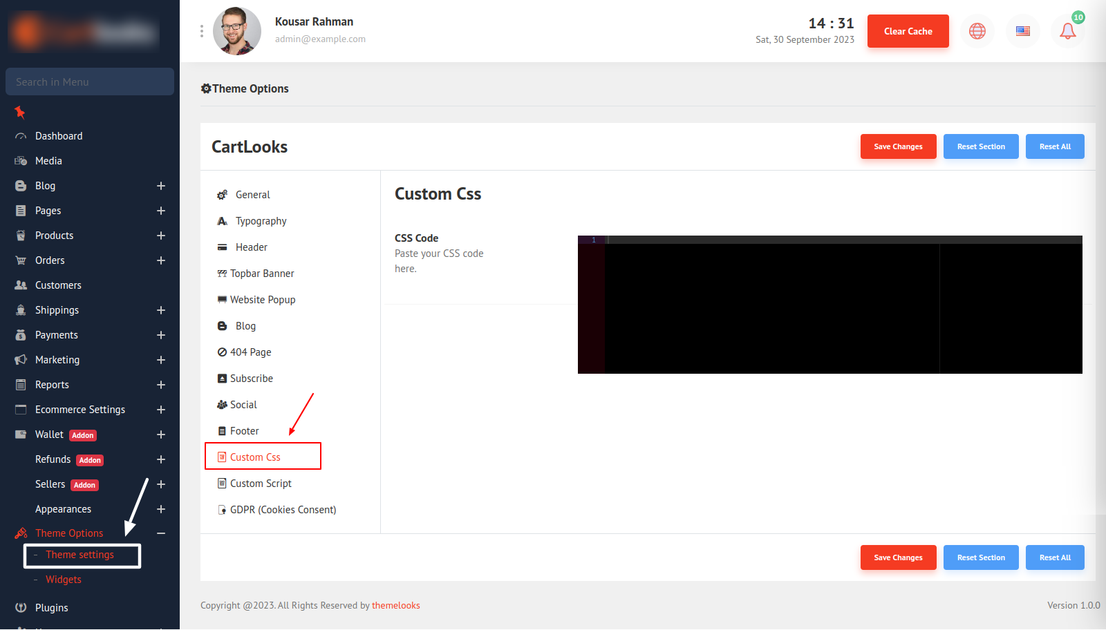 Click Save Changes to save theme options. Click Reset Section to reset only this section. Click Reset All to reset all theme options.