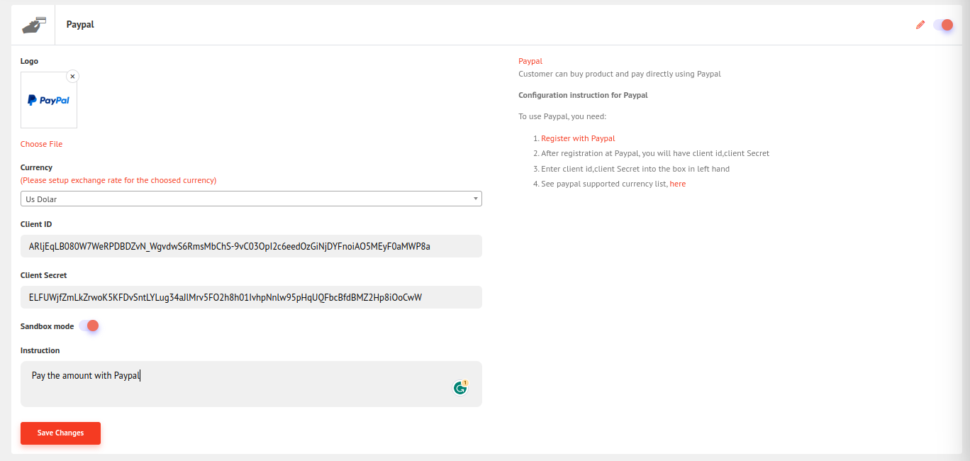 For Paypal client id and client secret follow the link https://www.paypal.com/bd/home and register. After registering, you will be given the client id and client secret. Now fill in the field and click save changes. And there is also a sandbox switch for check purposes, you can switch it off for live payment.