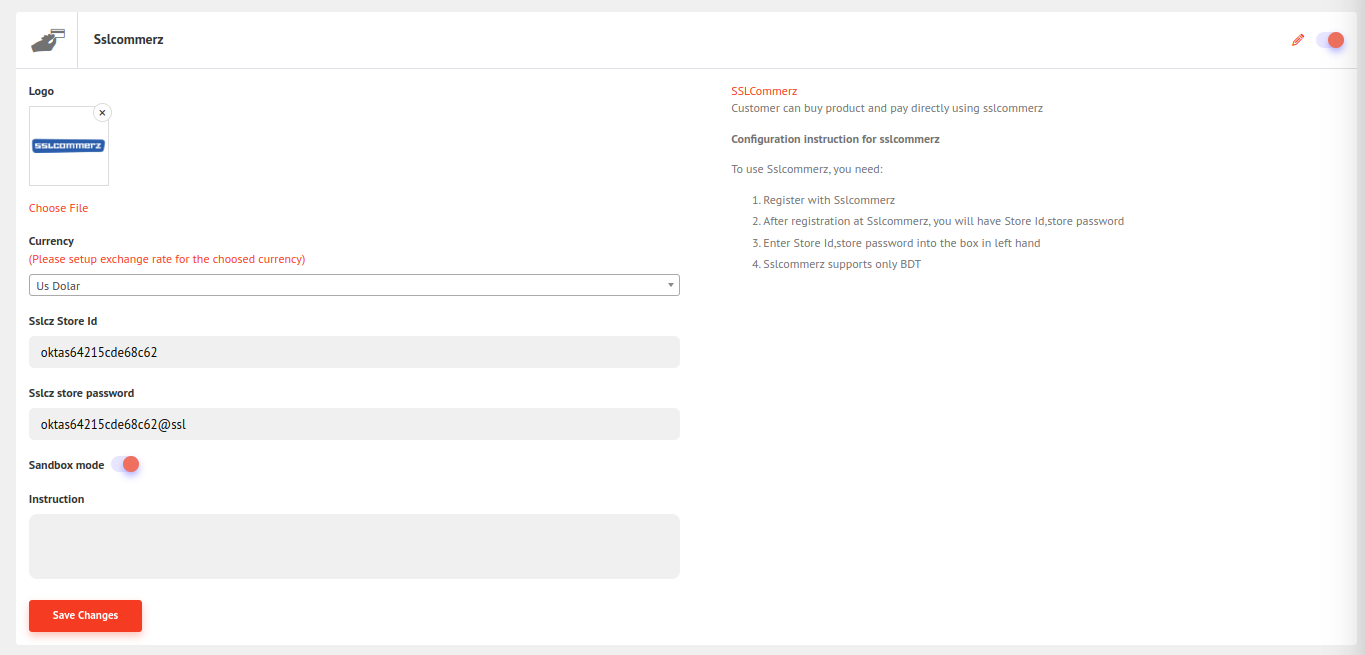 For the Sslcommerze store id and store password follow the link https://sslcommerz.com/ and register. After registering, you will be given the store id and store password. Now fill in the field and click save changes. And there is also a sandbox switch for check purposes, you can switch it off for live payment.