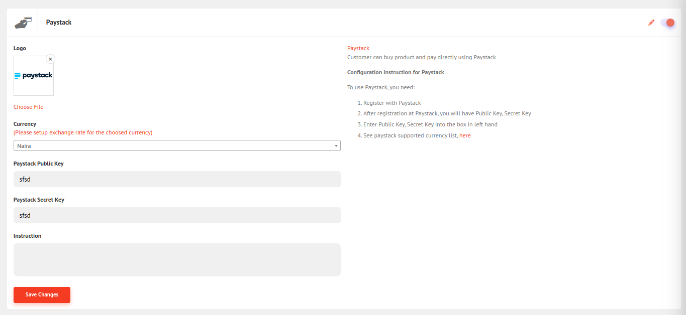 For the Paystack public key and secret key follow the link https://paystack.com/ and register. After registering, you will be given the public key and secret key. Now fill in the field and click save changes.