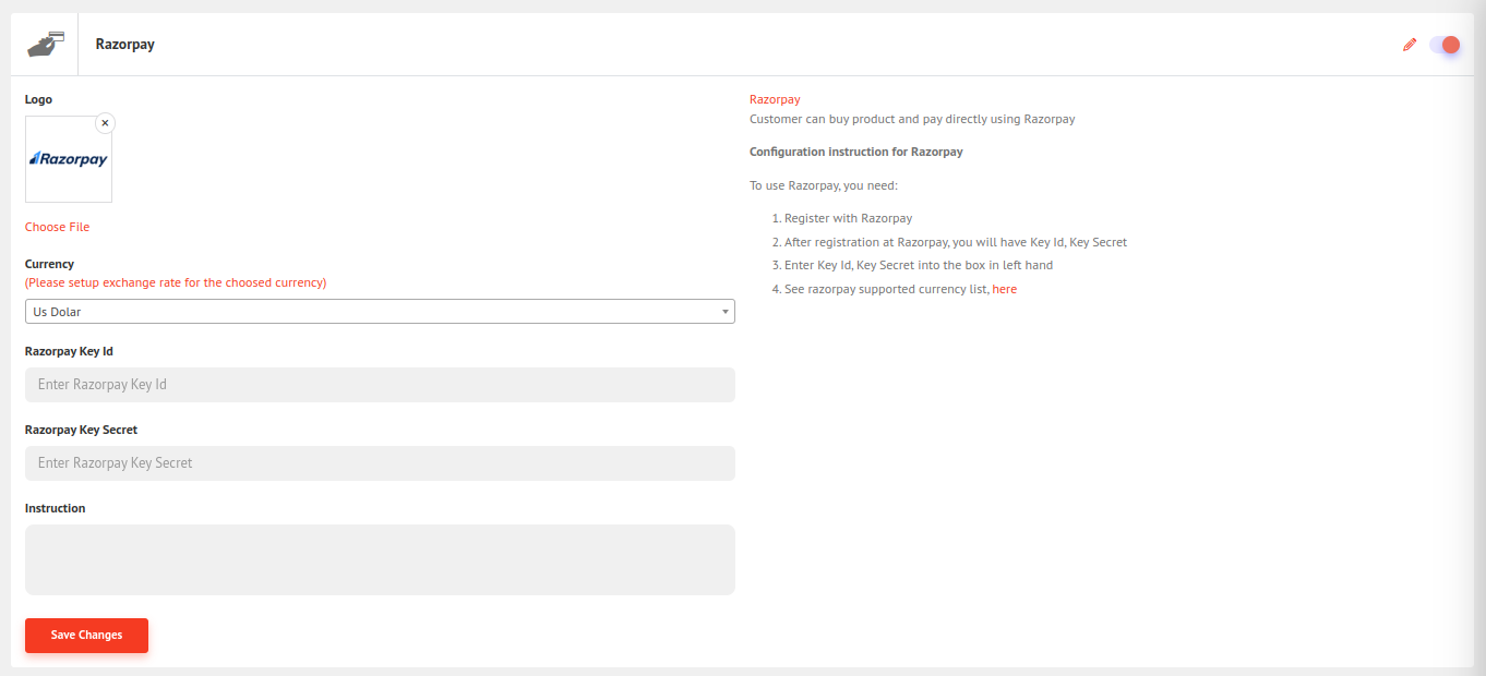For the Razorpay key id and key secret follow the link https://razorpay.com/ and register. After registering, you will be given the key id and key secret. Now fill in the field and click save changes..